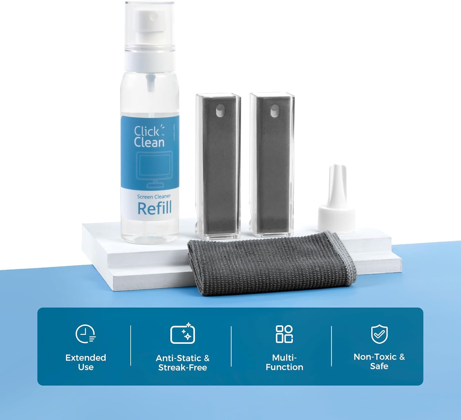 • ALL-IN-ONE MULTIFUNCTIONAL CLEANER KIT- In addition to the 2 screen cleaners included, you get one 4oz bottle of refill, 1 microfiber cloth, 1 mini funnel (built-in), and a sprayer. The refill extends the product's life; the mini funnel helps you refill the cleaner; the sprayer mounts to the refill spout, and the fibre cloth is a new product.