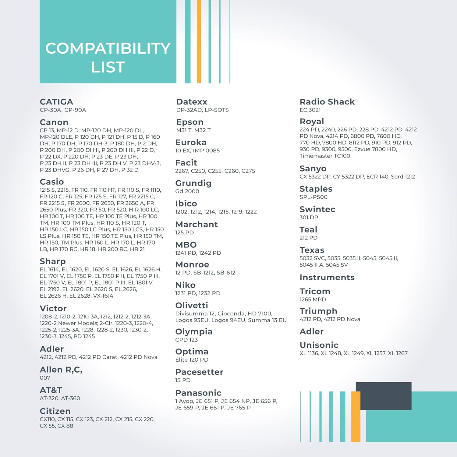 • Fits popular caclulators including Sharp EL-1750V, EL-1801V, and more, Casio HR-170RC Plus, HR-300RC, HR-200RC, HR-100TM, HR-150TM, and more, Canon P23-DH V, P23-DHV-3, P170-DH3, and more, Catiga CP30A, CP90A