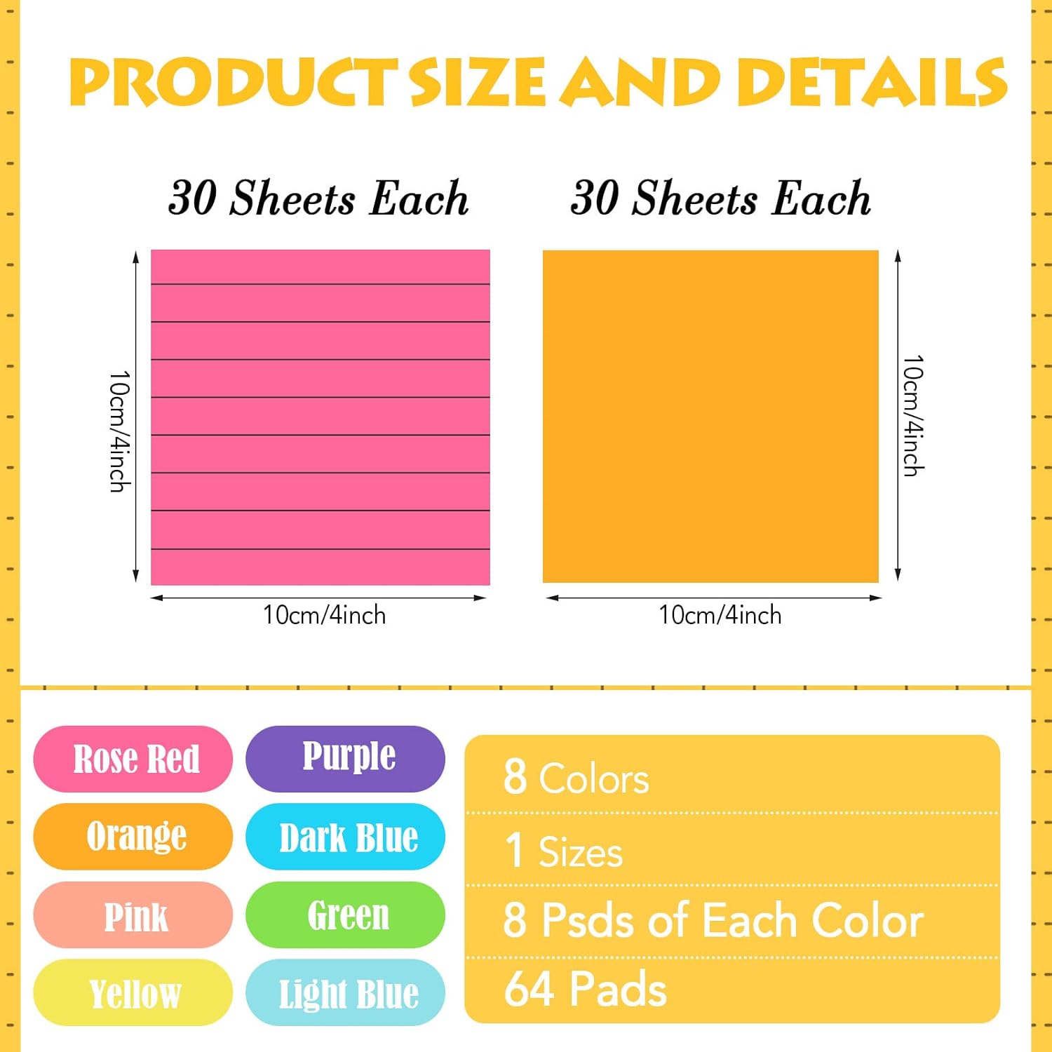 Yexiya 64 Pcs Lined Sticky Notes Self Stick Notes with Lines Bright Assorted Colors Sticky Pad for Home Office Products Post Memos, 1920 Sheets(3 x 3 Inch,Lined, Blank)