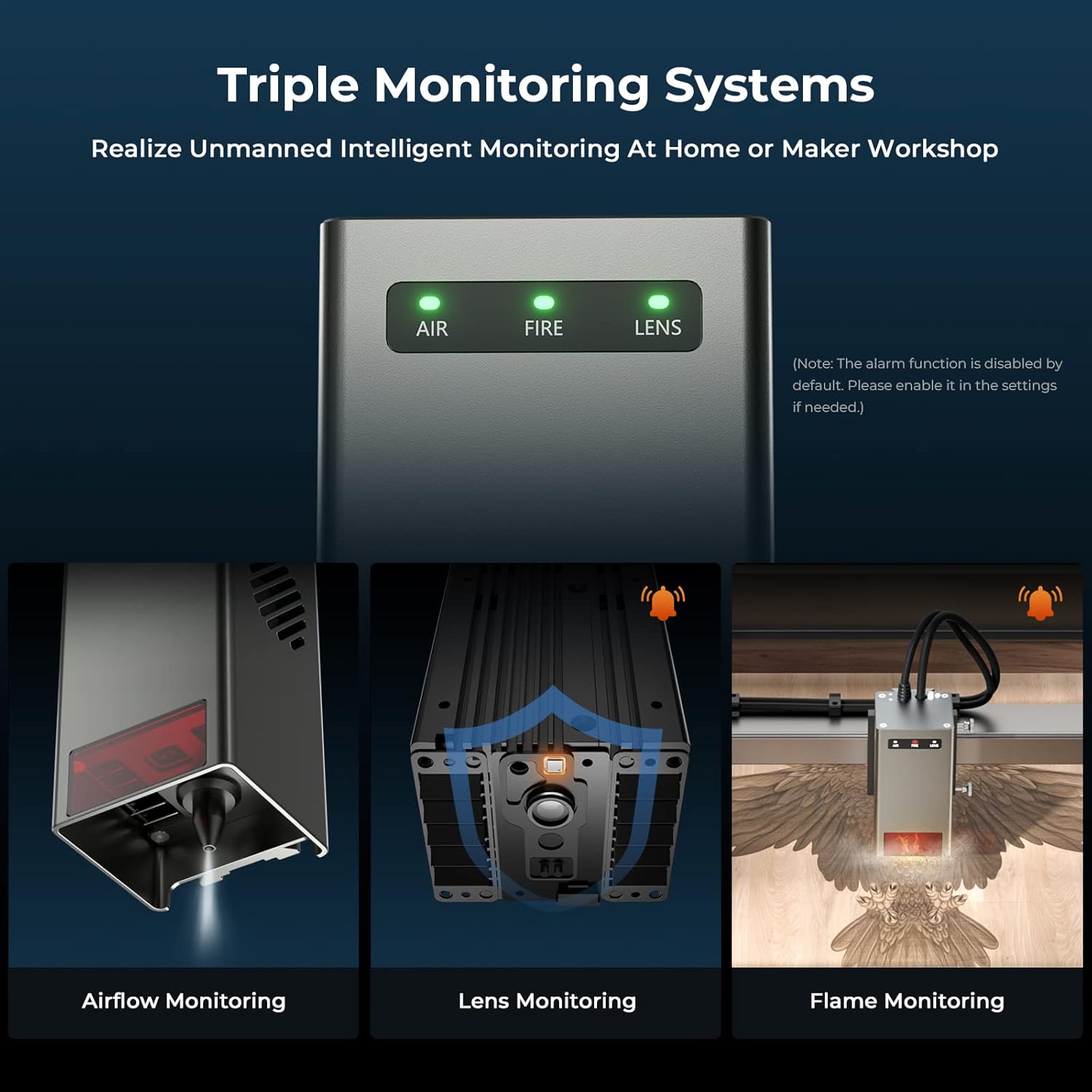 • Triple Intelligent Monitoring System - The Creality falcon 2 laser engraver has a triple intelligent monitoring system that includes airflow, flame, and lens monitoring. It reminds the user of the airflow size and stops the machine immediately if a flame is detected. The lens monitoring system triggers an alarm when the lens is dirty
