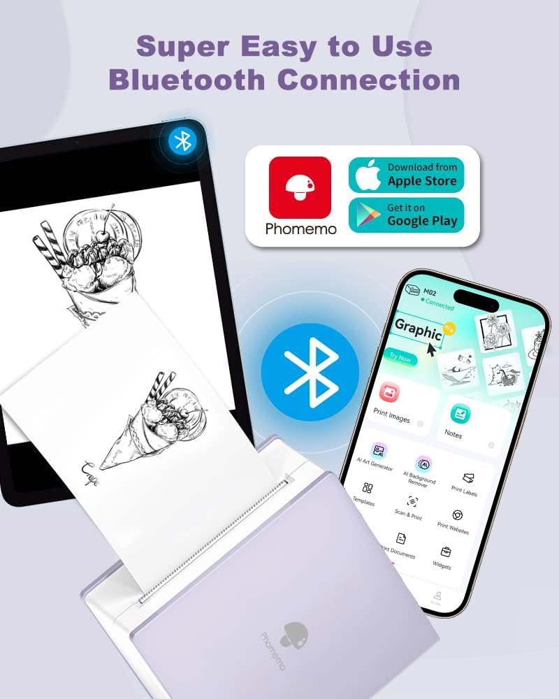 • Portable Size and Fashion Design- M02 pocket printer simple and stylish shape with mini size (3.39 x 3.31 x 1.65 inches) slips neatly into your pocket. This sticker printer shares joy with family and friends during leisure moments, holiday moments