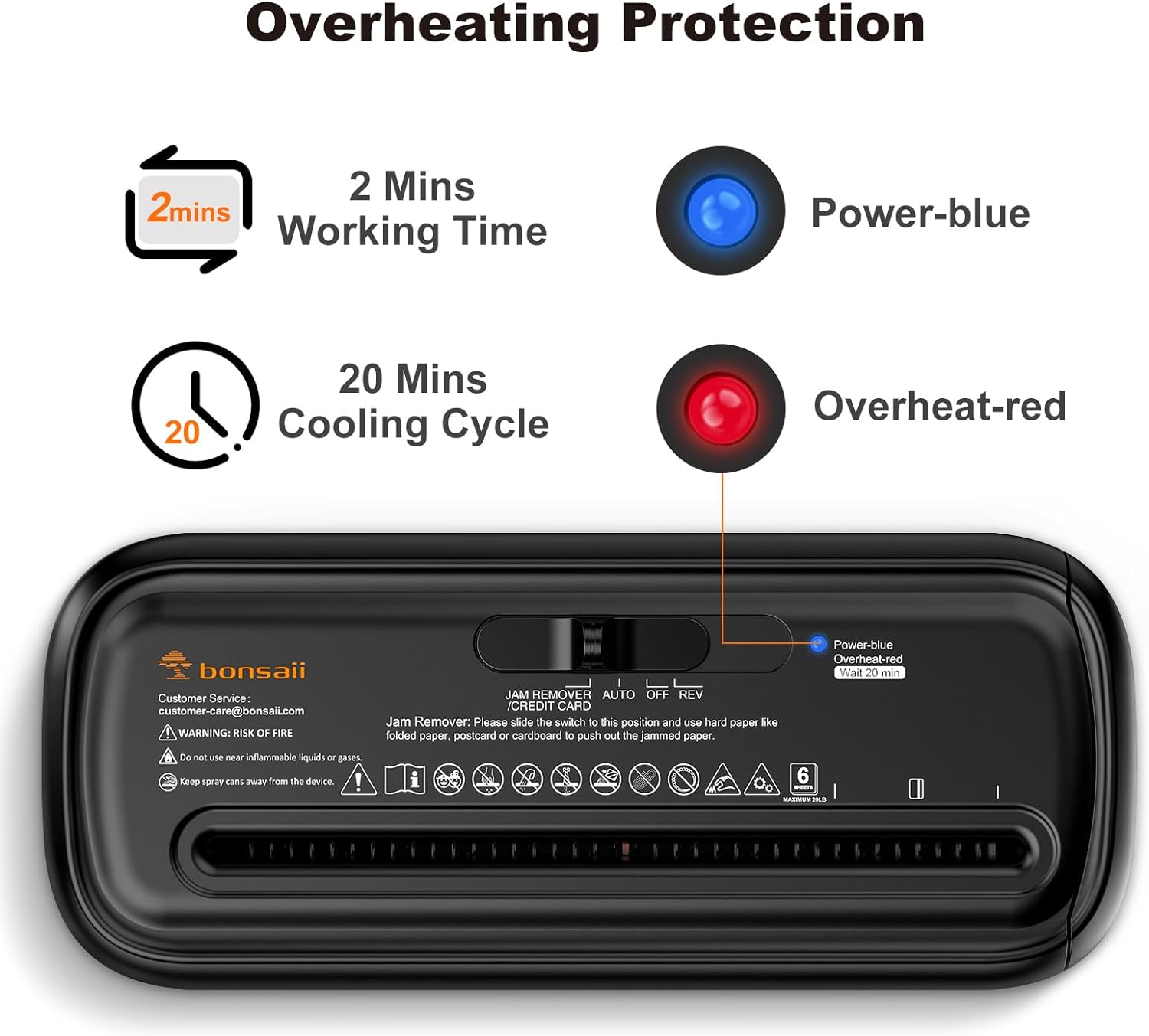 • Overheating Protection: Upgraded overheat warning protection auto start, when the red light is on, the shredder stops working and then needs a 20-minute cool-down, makes shredding machine be more safe while using it.