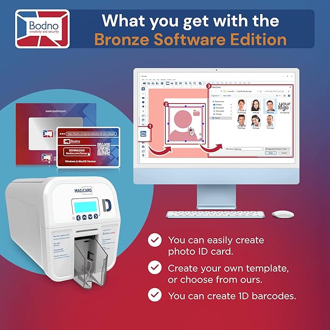 • BODNO BRONZE EDITION SOFTWARE WITH ACTIVATION CODE: The Magicard D comes with Bodno Bronze Edition software, which offers pre-made templates and drag-and-drop design elements for easy ID card creation. Say goodbye to USB sticks! The software is accessible through a secure activation code.