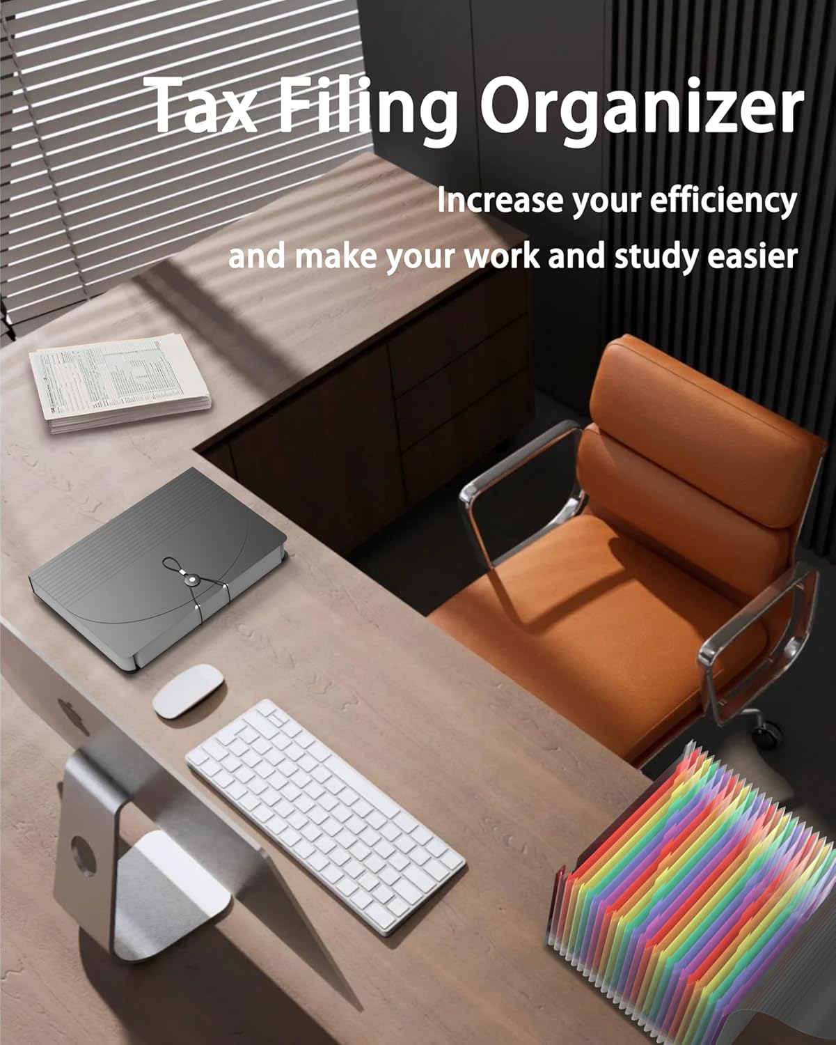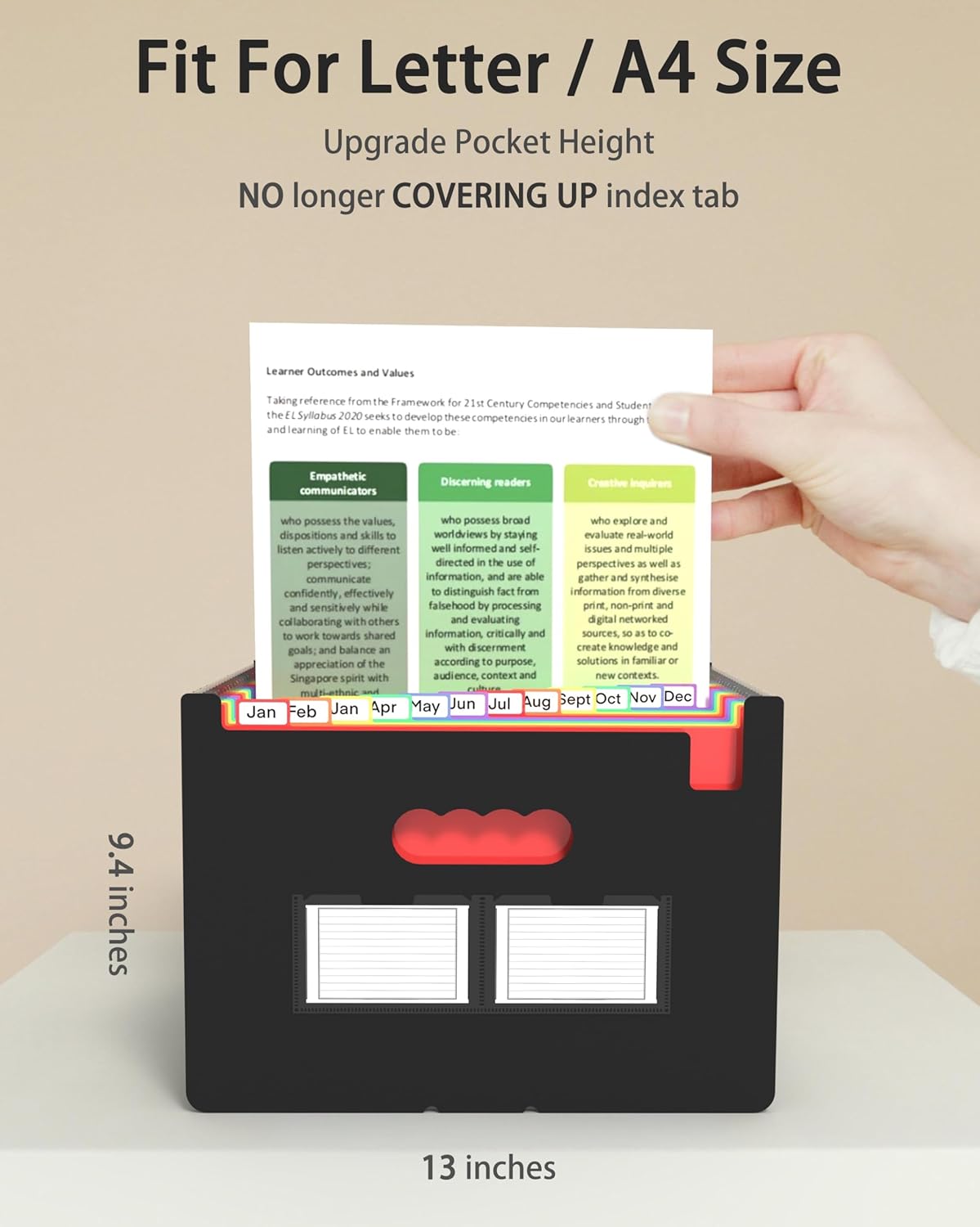 • 📂【EXPANDABLE & HIGH CAPACITY】-The file organizer keeps each slot's papers separated and organized in a good manner. 24 pockets expandable file folder. Product Size: Length: 13” High: 9.4'', width:1.96"-27". Expandable property gives it a possibility to hold approximately 3000 A4 sheets.