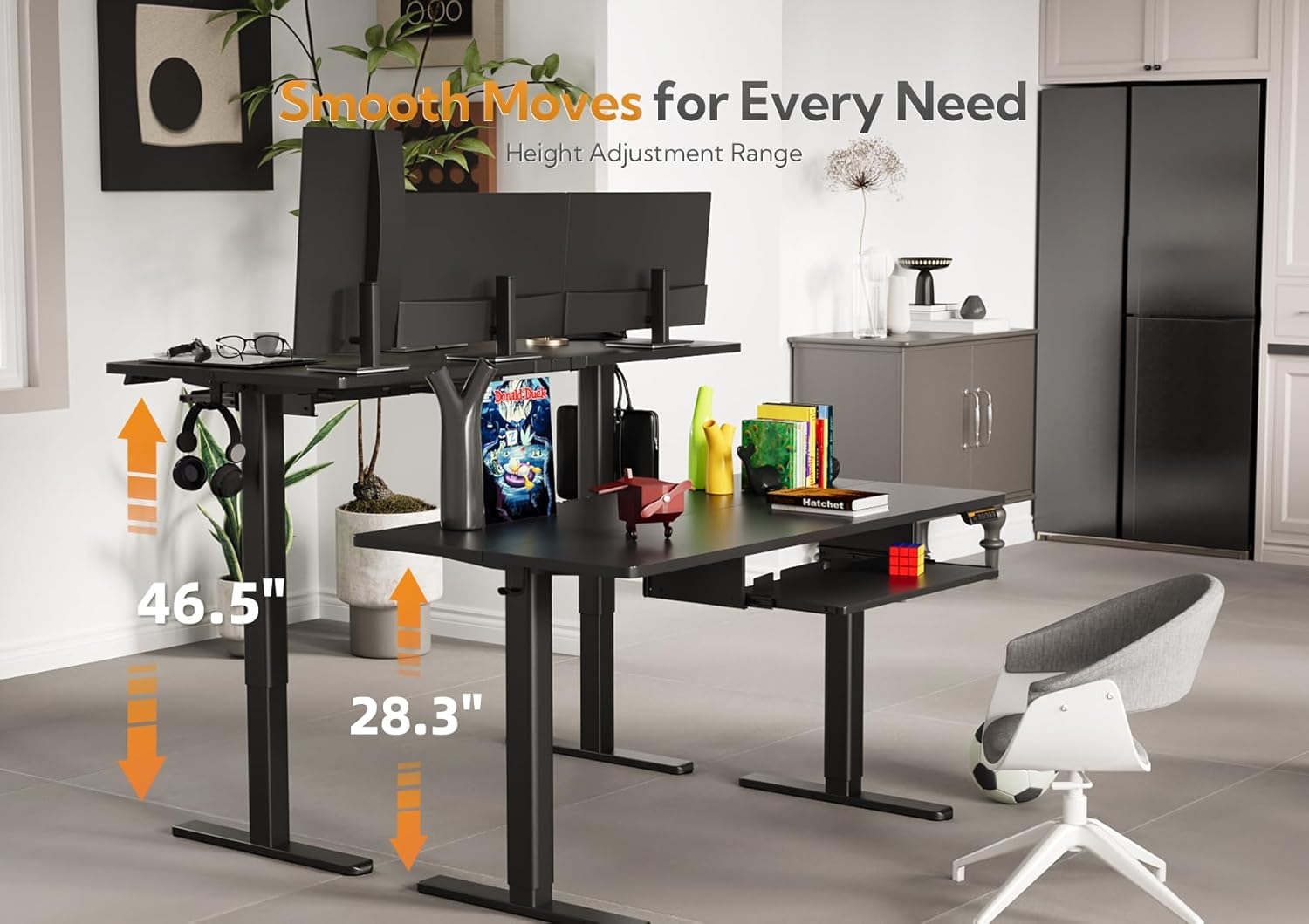 • Smooth Electric Height Adjustment: Eletric standing desk features a robust motor, allowing you to effortlessly adjust the height from 28.3 inches to 46.5 inches (including the 2.36-inch desktop thickness). With four programmable height presets, you can easily find your preferred height for maximum comfort and convenience.