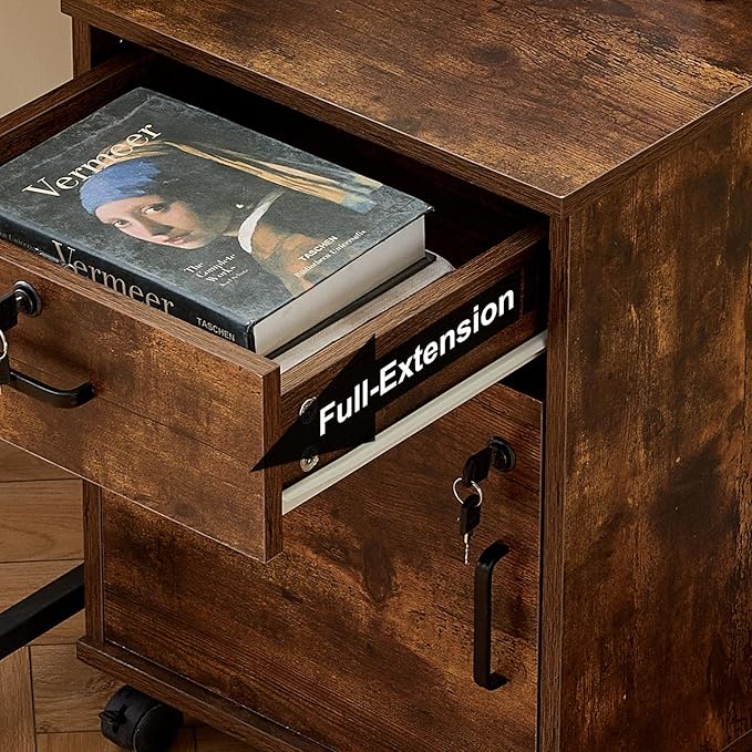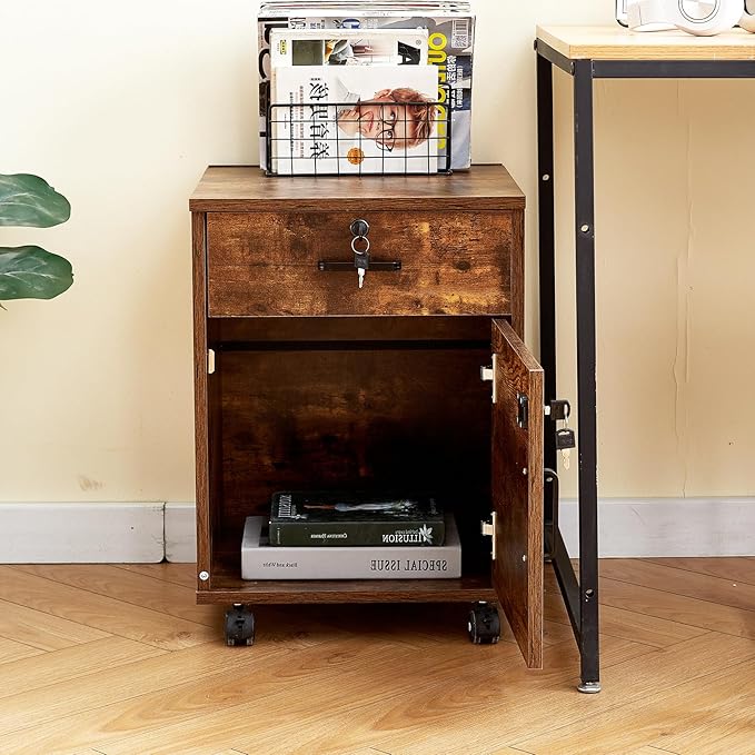 TUKAILAi Mobile File Cabinet with Lockable Drawer & Door, Under Desk Rolling Filing Cabinet with 4 Wheels, Wooden Stationery Storage Cabinet for Home Office (Rustic Brown)