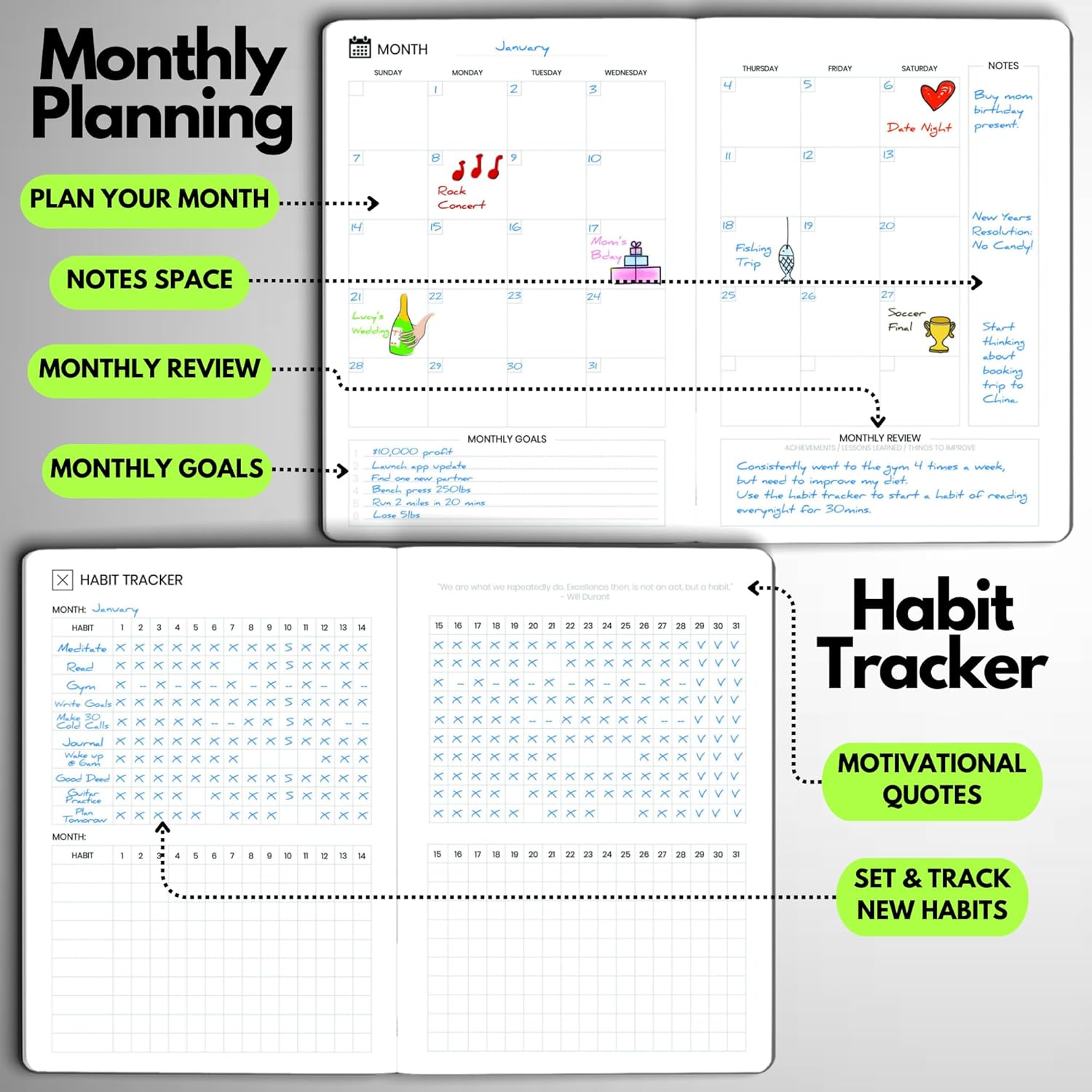 • STAY ALIGNED WITH YOUR GOALS – Use built-in goal-setting tools and review prompts to stay focused on long-term success—whether you’re managing business milestones, career growth, or personal development.