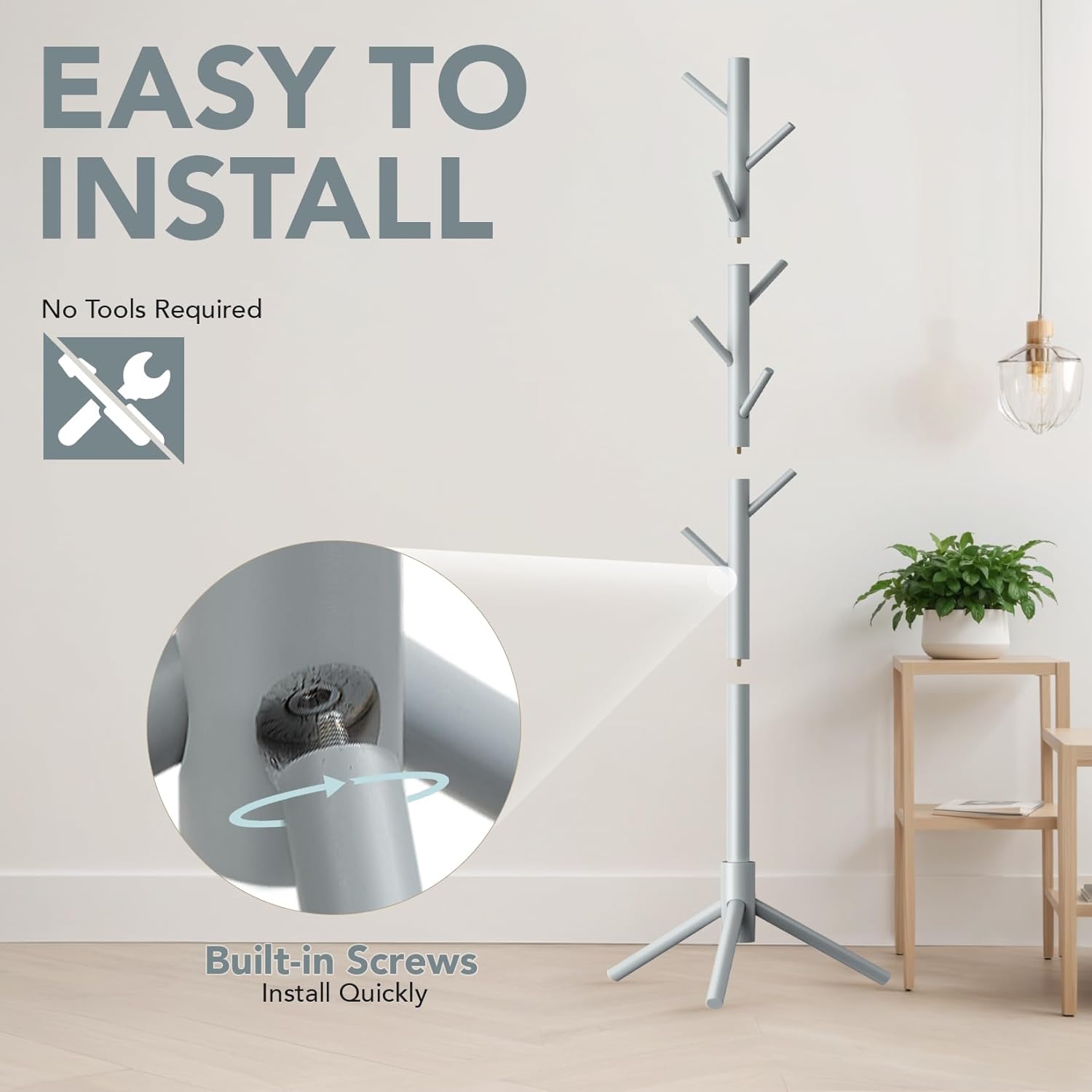 • Easy Installation: Each connection is equipped with metal screw holes with screw-in design. Turn and tighten the base of the coat rack, the four sections of the center pole and the eight hooks in order. No additional tools are required, saving tedious steps, five minutes to complete assembly for immediate use