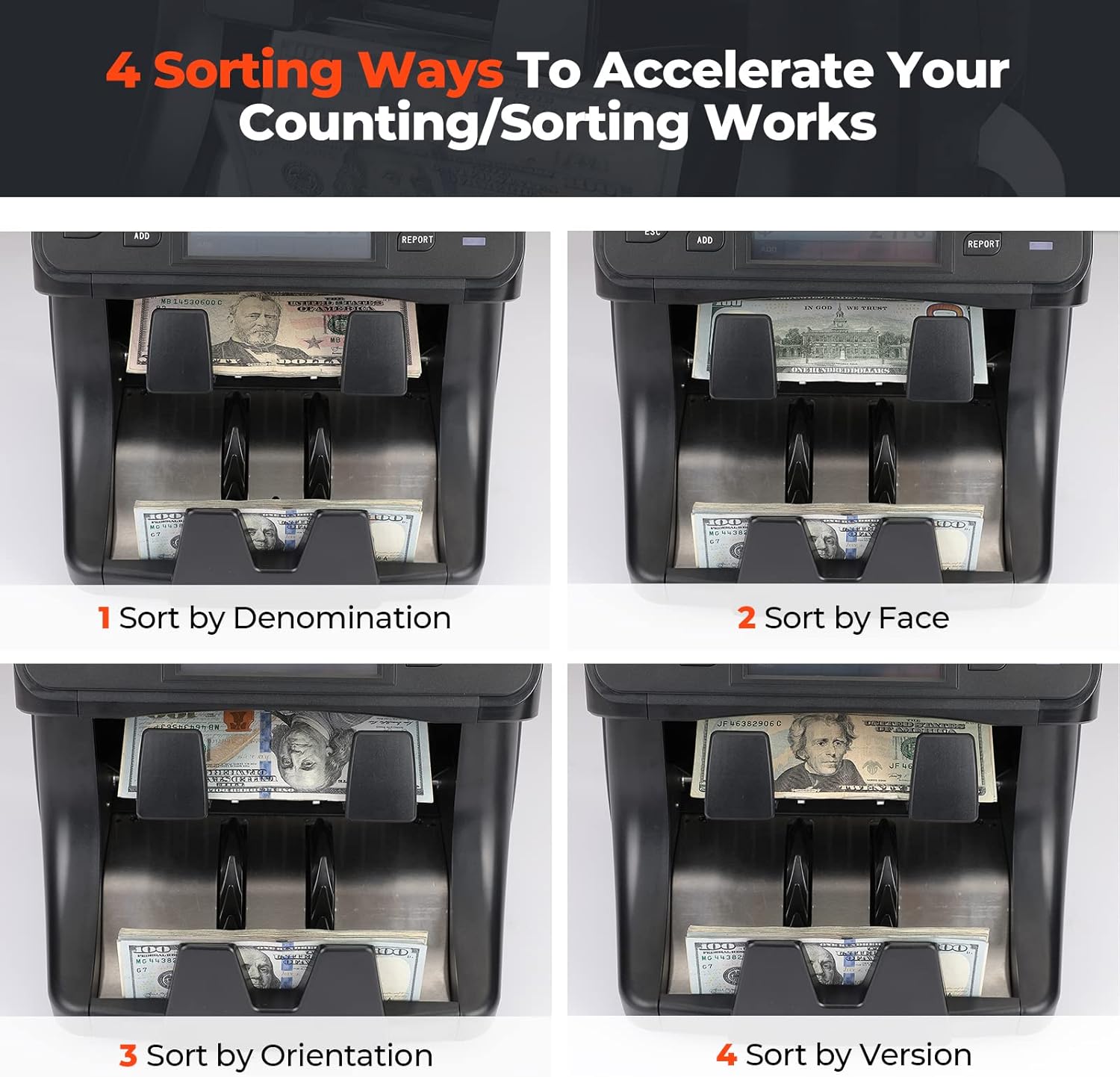 • ✅[Not Just Count, also Sort] MUNBYN 2024 Newest Mixed Denomination Money Counter Machine. Counts mixed denomination bills, reports the total value/breakdown, and sorts bills by the reject pocket. It can also sort the bills by Denomination/Face/Orientation/Currency/Version. Easily sort out a large amount of mixed bills into bundles of $1, $2, $5, $20, $50, $100. Ideal for big cash flow business weekly bank deposit