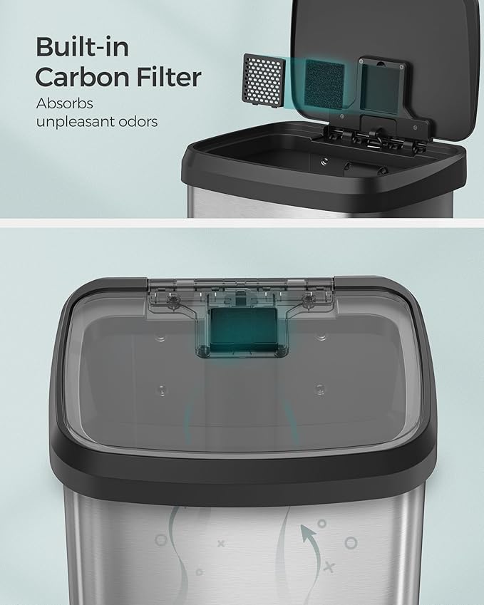 • [Thoughtful Detailing] The carbon filter in the lid helps absorb unpleasant odors, keeping your kitchen smelling fresh. Included are 15 liner bags (16-18 gallons) that perfectly fit this kitchen can