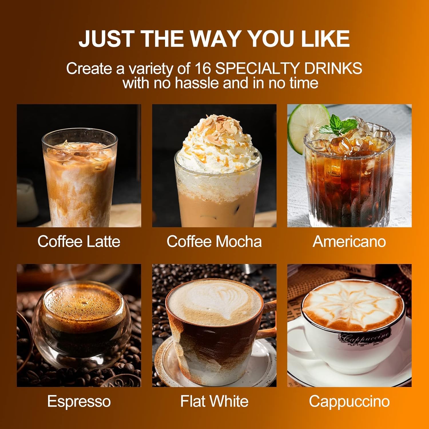 • ☕ Touch Screen: The touch screen display simplifies how to make your favorite coffee in 3 easy steps: Grind, Brew and Milk;16 kinds of coffee,each coffee all can adjust the water content, milk content, coffee concentration.Easily choose from Lattes, Cappuccinos, Americanos, Espressos, Flat Whites, Macchiatos and many, many more!