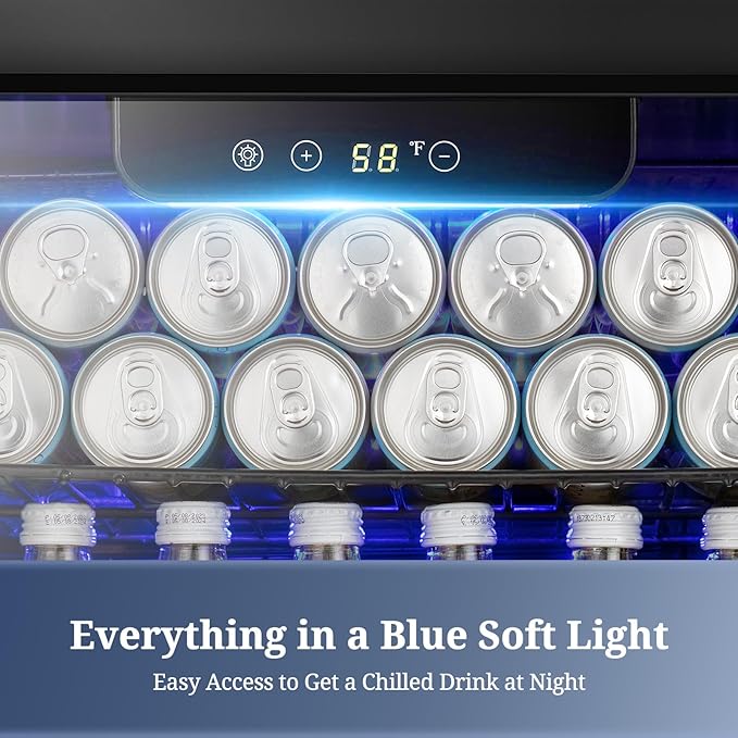 • Elaborate design:This Beverage cooler runs on a powerful but quiet compressor. Built-in blue LED light allows you to clearly find drinks even at night as well as makes your drink look more precious. It also has adjustable shelving for a variety of beverages