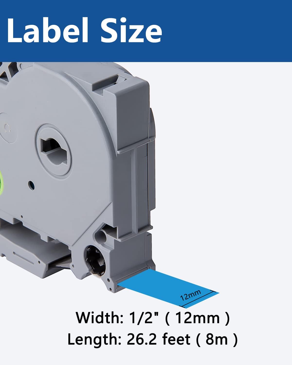 • Size - 1/2" width x 26.2' length ( 12mm x 8m ) each 12mm label maker tape. Color - Black ink on blue tape