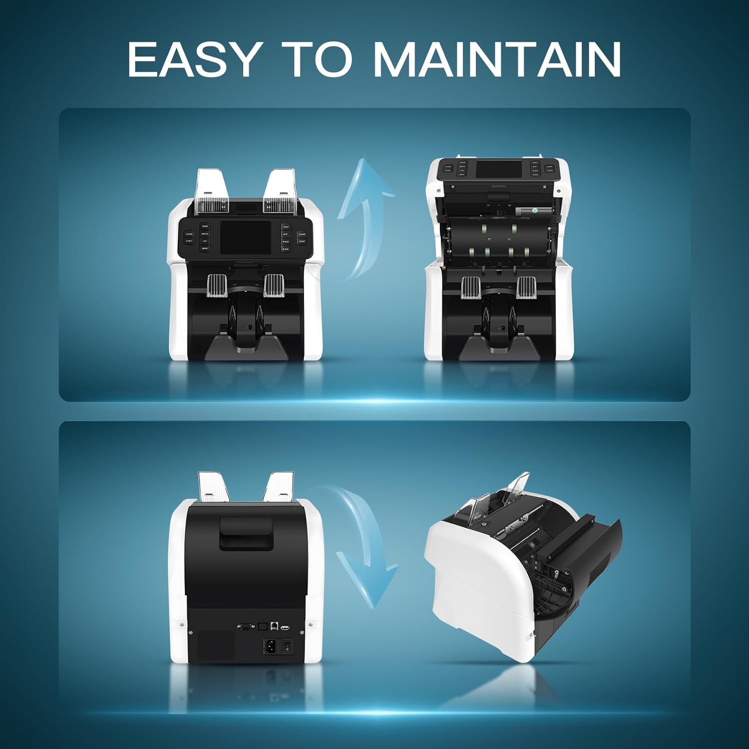 • Revolutionary Design: The most compact two pockets money sorter in the market, the passage can be fully opened from front(press the button under the panel), easy to make daily clean and remove foreign objects. Occupy a little bigger footprint than a normal bill counter, save working space