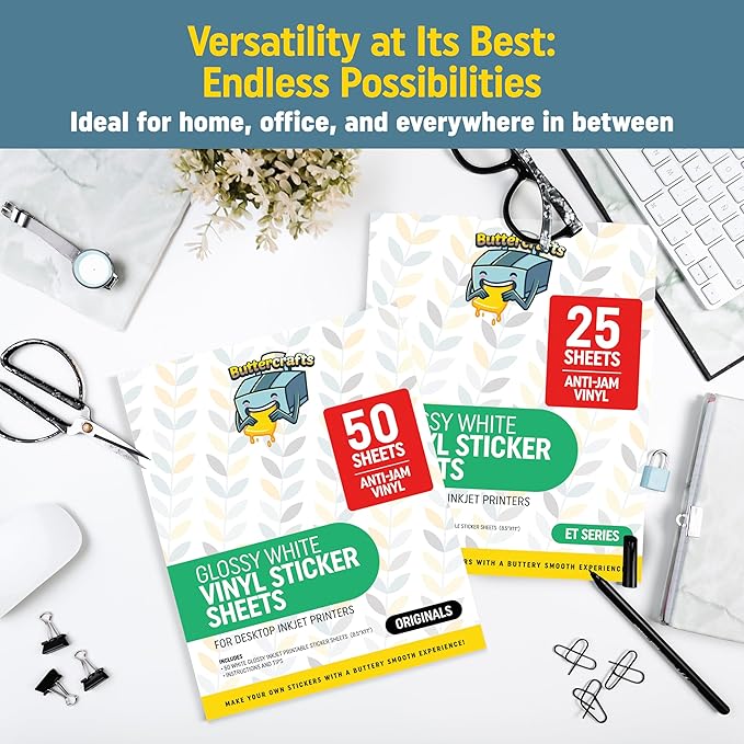• BUTTERCRAFTS PREMIUM PRINTABLE STICKER PAPER - 25 Sheets / 8.5x11 / White Glossy Sticker Paper / Sticky Permanent Adhesive / Unbranded Backing Sheet / Works with most cutting machines