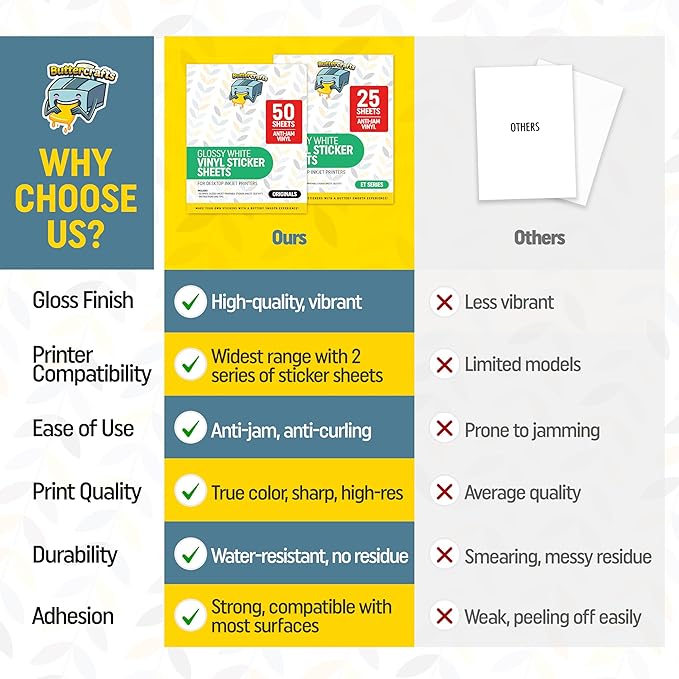 • BUTTERCRAFTS PREMIUM PRINTABLE STICKER PAPER - 50 Sheets / 8.5x11 / White Glossy Sticker Paper / Sticky Permanent Adhesive / Unbranded Backing Sheet / Works with most cutting machines