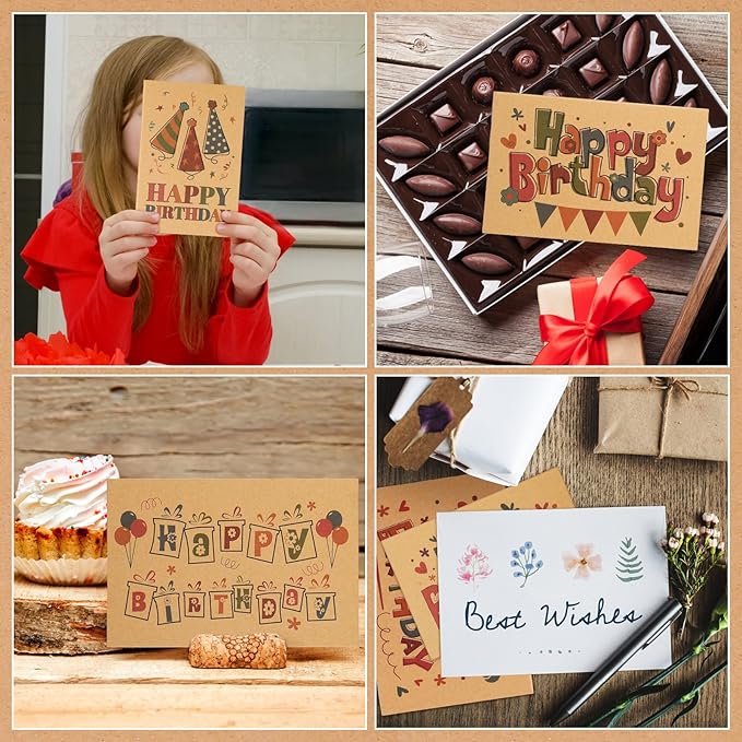 Harloon 200 Pack Happy Birthday Card Assorted Bulk with Blank Envelopes and Stickers 4 x 6 Inches Greeting Blank Happy Birthday Cards for Men Women Adults Kids, 20 Styles(Kraft Style)