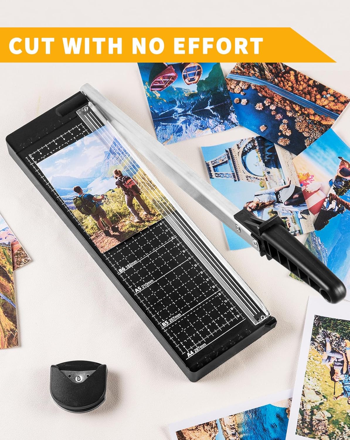 • [POWERFUL 8-SHEET CAPACITY] This guillotine paper cutter slices through 8 sheets effortlessly (16 lbs/11.7 inch paper). Cutting fewer sheets at a time extends the blade's lifespan, saving you money. Perfect for crafting, it handles printer paper, sticker sheets, pictures, labels, and cardstock like a pro