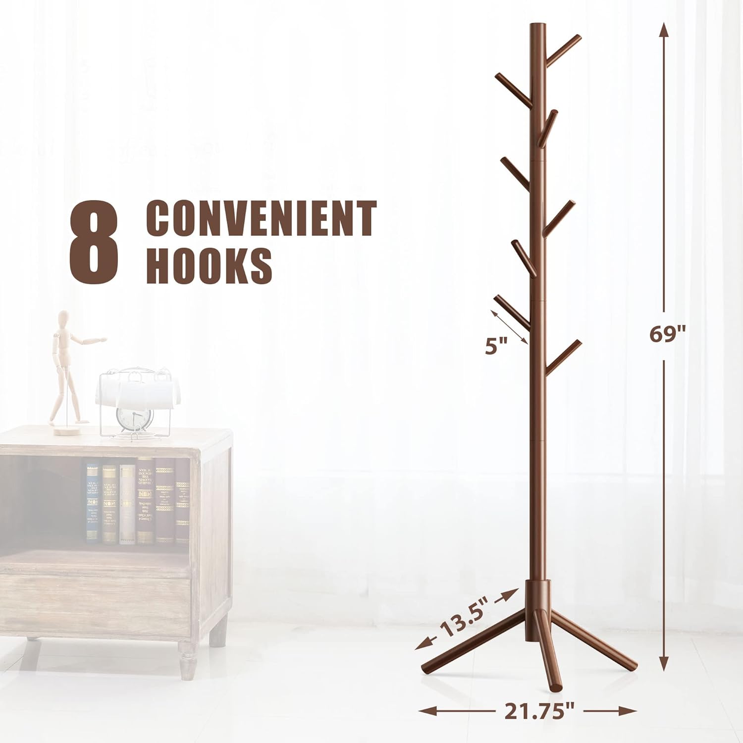 Haddockway Wooden Coat Rack Stand with 8 Hooks New Zealand Pine 3 Adjustable Coat Standing Tree Easy Assembly for Coats, Hats, Scarves and Handbags for Entryway, Hallway, Bedroom, Office,2 PCS