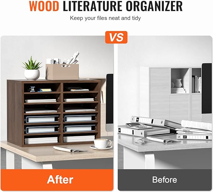 • Maximize Your Space: Say goodbye to cluttered desktops with VEVOR 20.4''x12''x16.1'' wood literature organizer. It has 12 compartments in total, arranged in 6 rows and 2 columns. You'll have ample space to store and organize books, documents, magazines, papers, and other materials. Keep your workspace neat and tidy with ease.