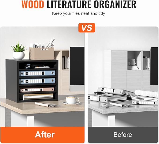 • Maximize Your Space: Say goodbye to cluttered desktops with VEVOR 13.9''x12''x13'' wood literature organizer. It has 5 compartments in total. You'll have ample space to store and organize books, documents, magazines, papers, and other materials. Keep your workspace neat and tidy with ease.