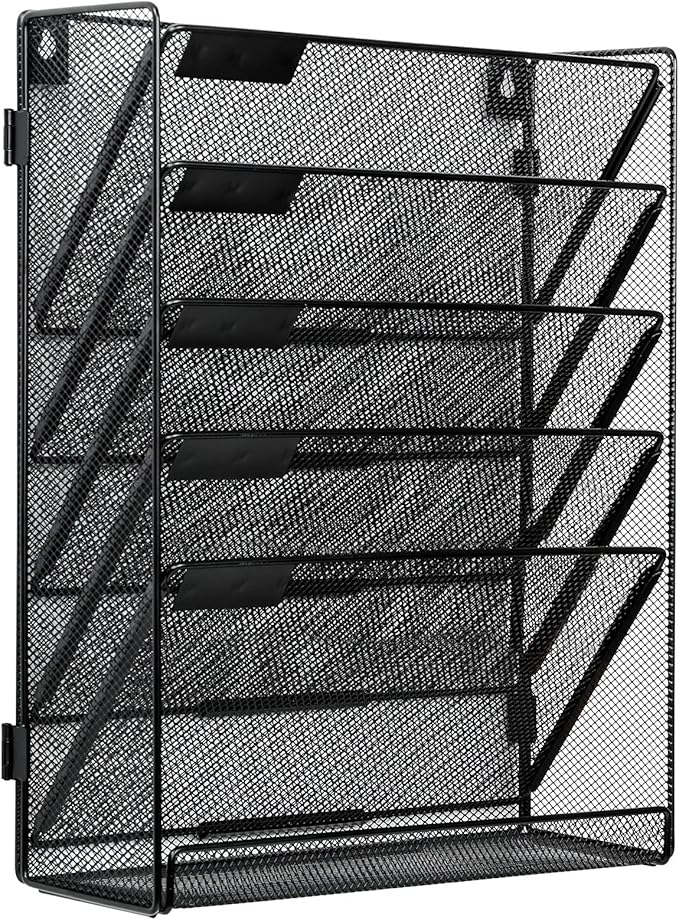 • 5+1 Tier Oversized Capacity: Wall mounted file organizer with 6 pockets stores 5 folders + accessories. Flat tray holds mail, bills, magazines. Includes white labels for instant office/home categorization.