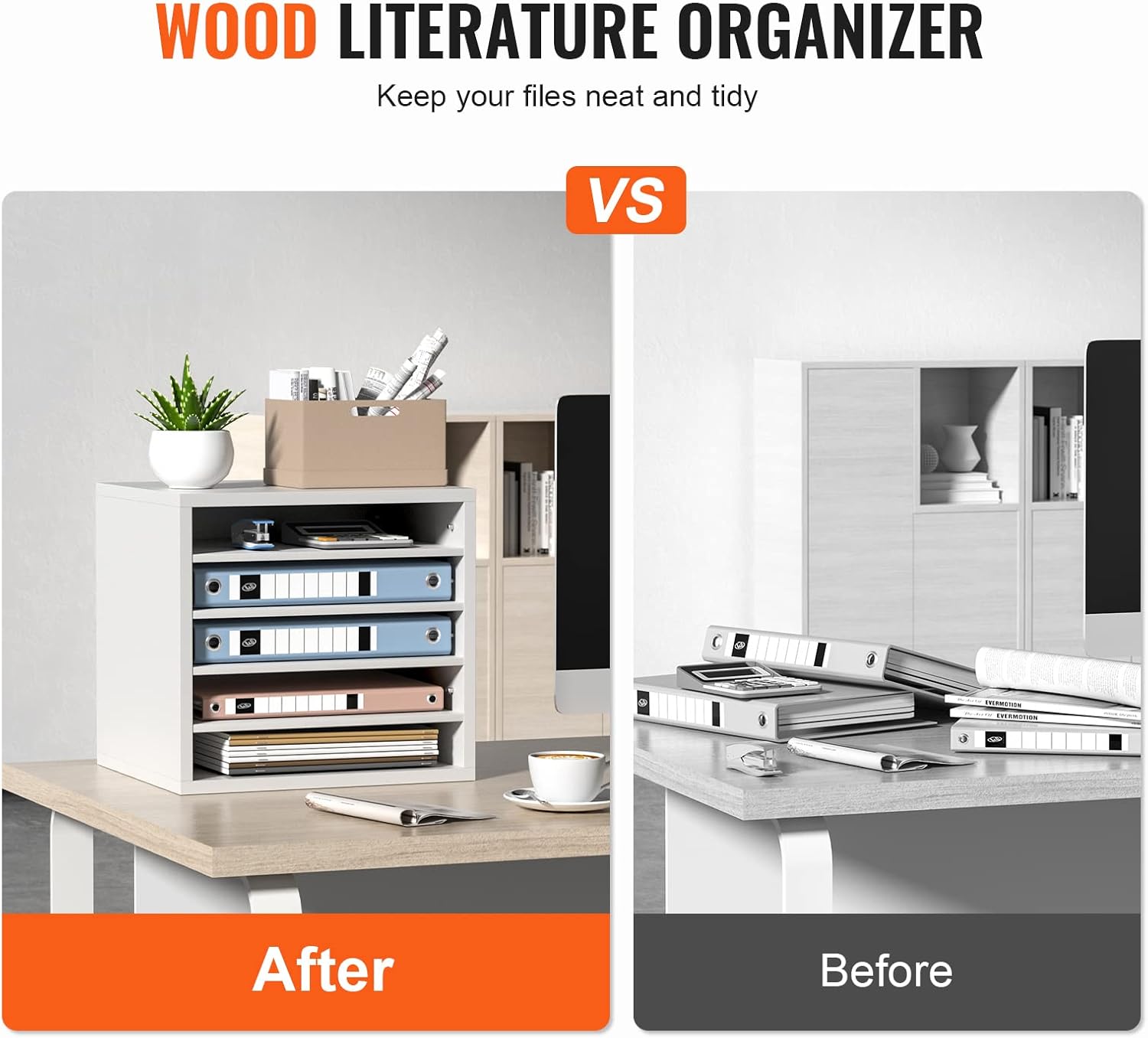 • Maximize Your Space: Say goodbye to cluttered desktops with VEVOR 13.9''x12''x13'' wood literature organizer. It has 5 compartments in total. You'll have ample space to store and organize books, documents, magazines, papers, and other materials. Keep your workspace neat and tidy with ease.