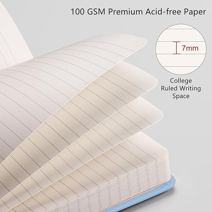 • LINED JOURNAL NOTEBOOK: RETTACY Lined Journal Notebook comes in a A5 size (5.7'' x 8.3''), 192 numbered pages, 7 mm college ruled, durable and smooth leather hardcover, 100 GSM thick acid-free paper, 180° lay-flat, pen holder, elastic closure band, 2 ribbon bookmarks, inner pocket & sticky notes