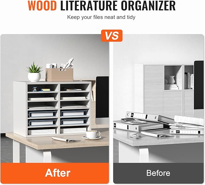 • Maximize Your Space: Say goodbye to cluttered desktops with VEVOR 20.4''x12''x16.1'' wood literature organizer. It has 12 compartments in total, arranged in 6 rows and 2 columns. You'll have ample space to store and organize books, documents, magazines, papers, and other materials. Keep your workspace neat and tidy with ease.