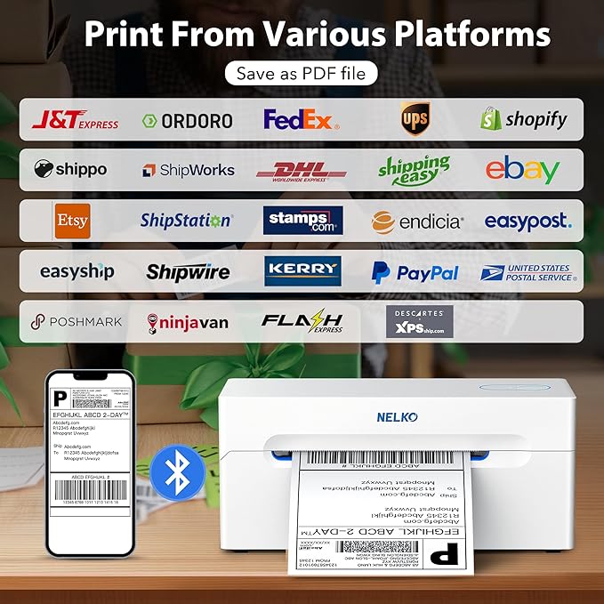 • Strong Platform Compatibility: This bluetooth shipping label printer can work with virtually all platforms, including Amazon, Ebay, Shopify, USPS, UPS, Esty, PayPal, Poshmark,etc.(Note: Please remember to save the logistics label as a PDF on the logistics platform, then upload it to the editor APP "NELKO" or "Shipping Printer Pro" for printing