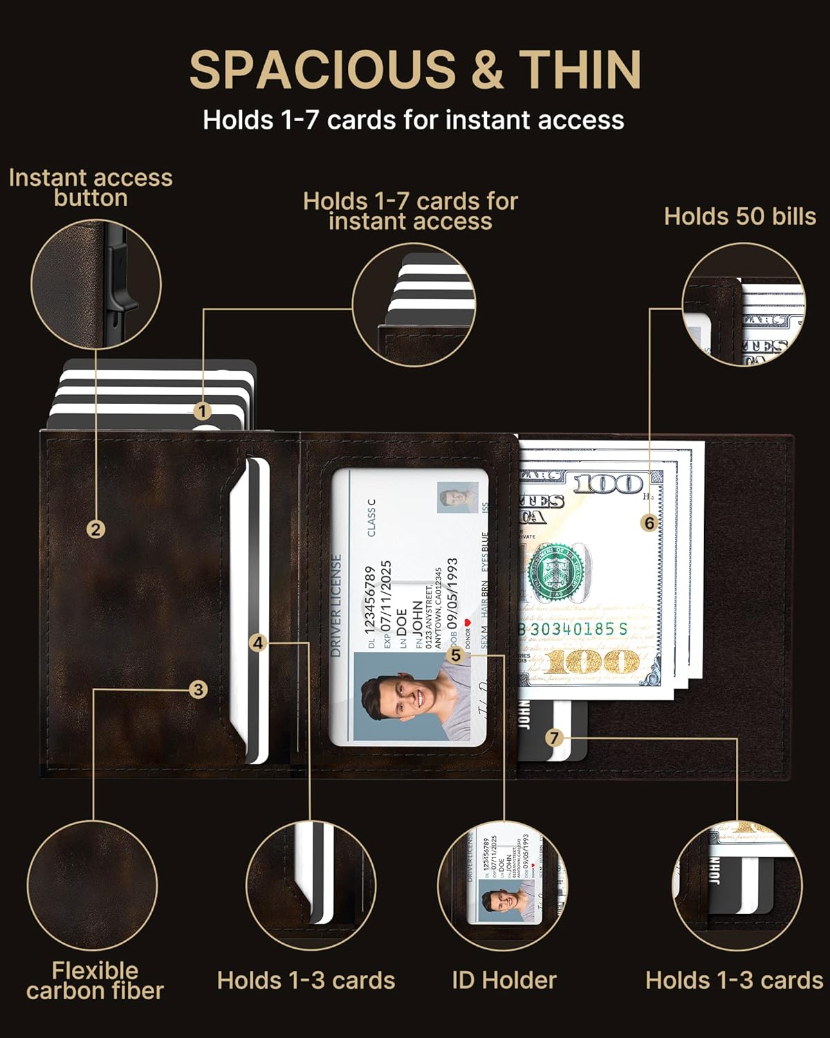 • 【QUICKEST ACCESS】Instant card access at the tap of a button by a single hand. Stores 10-15 cards and 15 bills total. The pop up aluminum card holder stores 6-7, the built-in cash slot stores 15 bills, and the ID window for driver's licenses.
