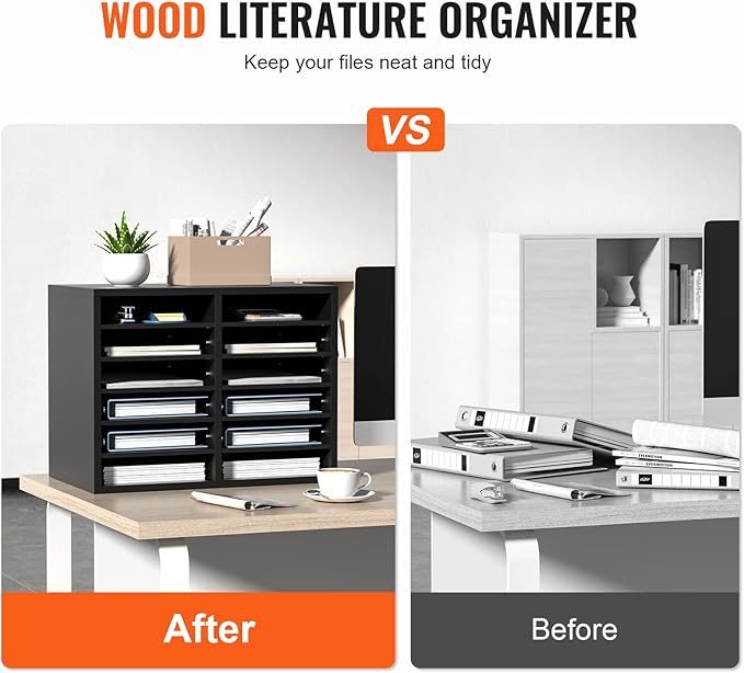 • Maximize Your Space: Say goodbye to cluttered desktops with VEVOR wood literature organizer. It has 12 compartments in total, arranged in 6 rows and 2 columns. You'll have ample space to store and organize books, documents, magazines, papers, and other materials. Keep your workspace neat and tidy with ease.