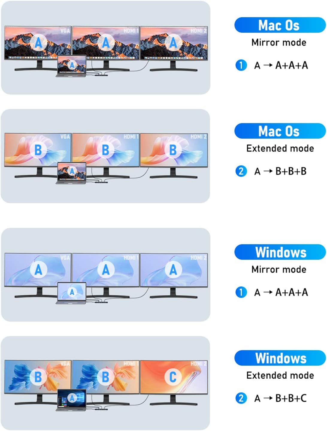 • 【Docking Station Dual Monitor 2 HDMI&VGA】This usb c dock will help you to easily achieve dual&triple monitor display,meets all your needs and make your work easier;Single use HDMI 1 can up to 4K 30Hz under DP1.4 source; And resolution support up to 4K@30Hz & 2K@60Hz when simultaneously connect dual hdmi;And resolution support up to 1080P for external 3 monitors when triply display under DP1.4 source;Notices:MacOs laptop only support SST mode, so all external monitor screens will be the same.