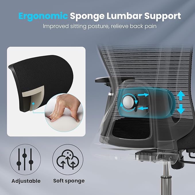 • Comfortable and Breathable: With high-quality reinforced mesh, our ergonomic office chair keeps your back cool and comfortable while keeping you focused and relaxed. It also has soft PU padded armrests and high-density sponge cushion for enhanced comfort.
