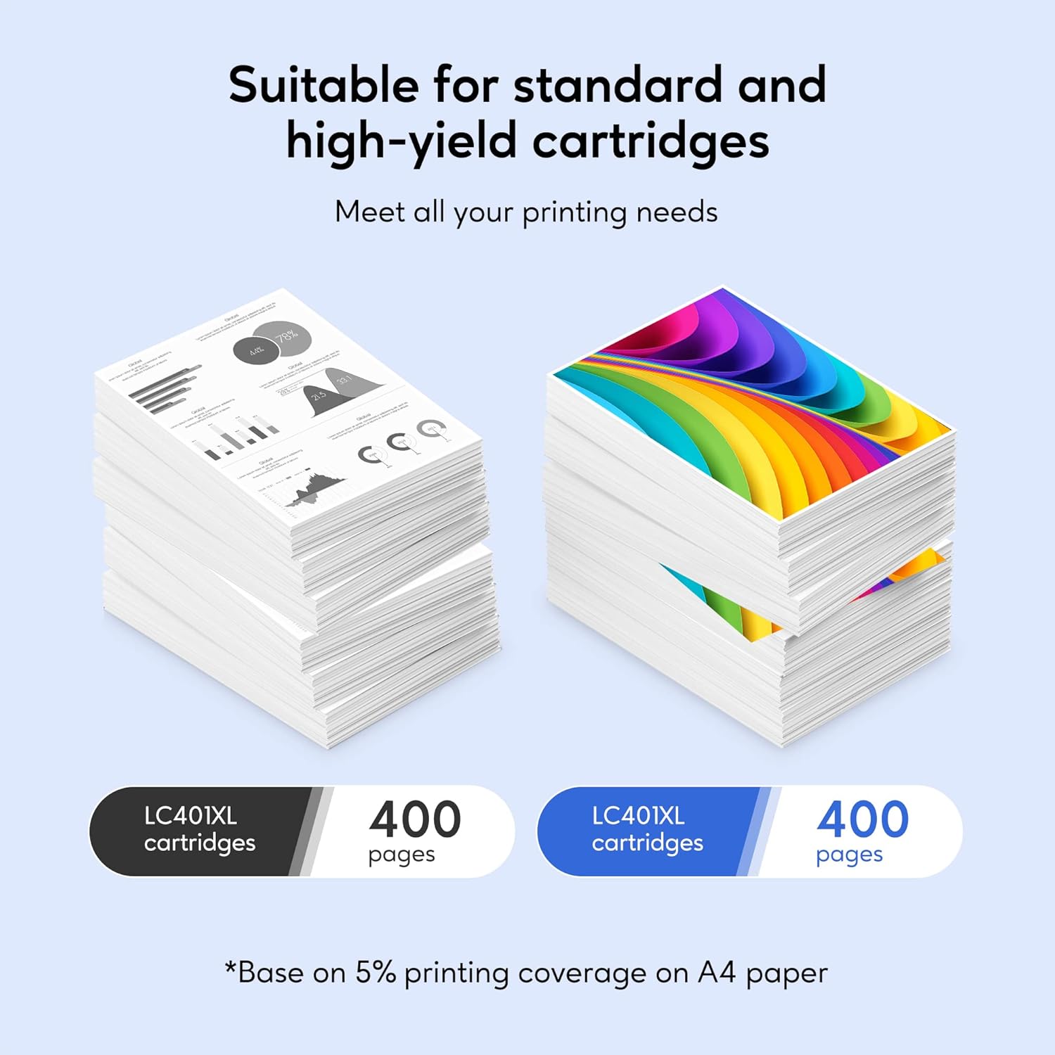 • Pages Yield: Up to 500 Pages per LC401 Black XL ink cartridge, 200 Pages per LC401XL Color ink cartridge.