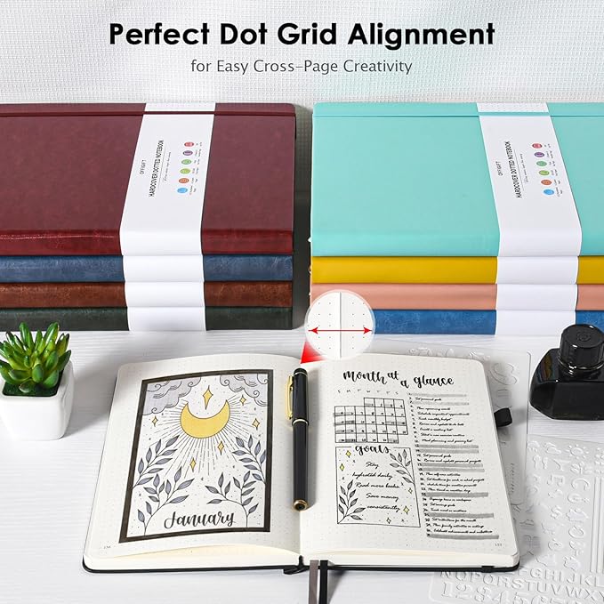 • 【Thick Paper for Writing Without Limits】Large A5 hardcover notebook (5.75"x 8.38"/146mm x 213mm), total 320 pages, includes 312 numbered pages(156 sheets). Each page includes 1107 dots with 5mm spacing: X27*Y41. Our INNOVATIVE PAPER TECHNOLOGY on 100GSM thick paper ensures a perfect canvas for your ideas - no bleed, no ghosting, as confirmed by tests with various pens commonly used in bullet journaling.