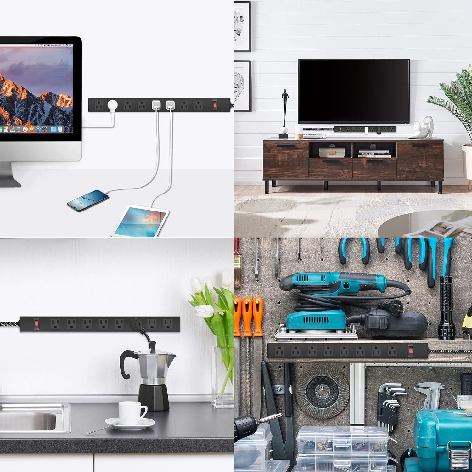 • 【8 in 1 Power Strip】This mountable power strip features 8 outlets and 1 switch, providing you with multiple options to connect your devices. With a 6 feet 14AWG braided cord, it ensures durability and easy reach to power sources. Rated at 1200J, 1875W, 15A, 125V, 60Hz, and with SGS certification, it guarantees safe and reliable charging.