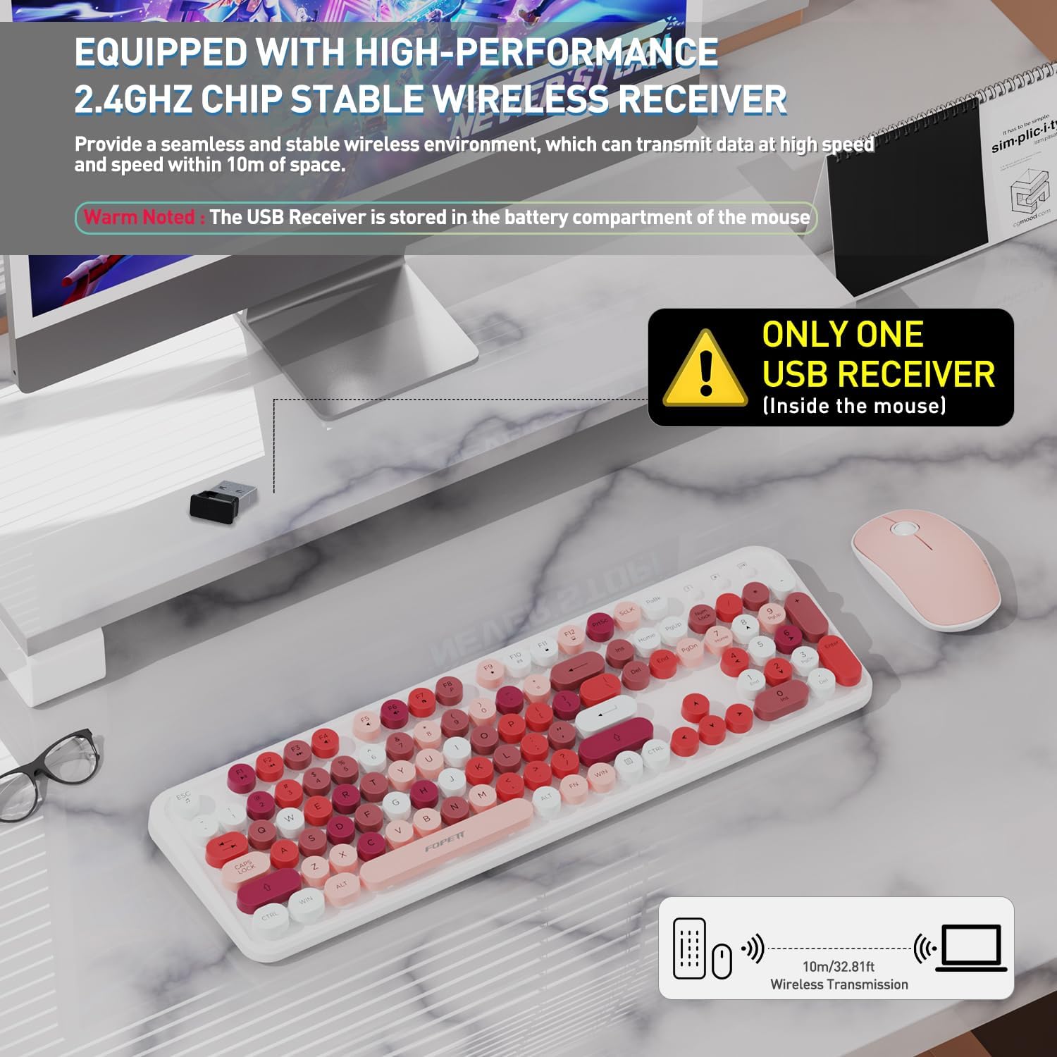 Cute Retro Wireless Keyboard and Mouse Combo with Round Key, 2.4Ghz Dropout-Free Connection, Typewriter Wireless Keyboard and Mouse Set for PC, Laptop, Desktop Computer - Pink Colorful