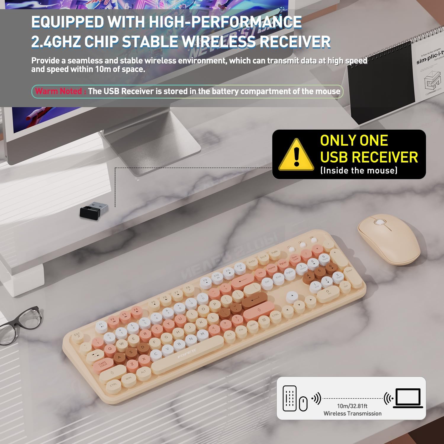 • Cute Wireless Keyboard - Stable 2.4G Wireless Connection : Enjoy a powerful wireless connection with a range of up to 10 meters (393.7 inches) for the keyboard and mouse combo. They utilize a shared Nano receiver, conveniently stored at the bottom of the mouse, Plug and Play.eliminating the need for additional software installation.keeping your desk clean.Keyboard size 17.5 x 5.5 x 1.3 inch With 105 Keys. Mouse size is 4.1 x 2.5 x 1.0 inch. Keyboard net weight: 1.57LB,Mouse net weight: 0.15LB.
