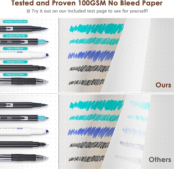 • 【Thick Paper for Writing Without Limits】Large B5 hardcover notebook (7.6"x 10"/193mm x 254mm), total 320 pages, includes 312 numbered pages(156 sheets). Each page includes 1887 dots with 5mm spacing: X37*Y51. Our INNOVATIVE PAPER TECHNOLOGY on 100GSM thick paper ensures a perfect canvas for your ideas - no bleed, no ghosting, as confirmed by tests with various pens commonly used in bullet journaling.