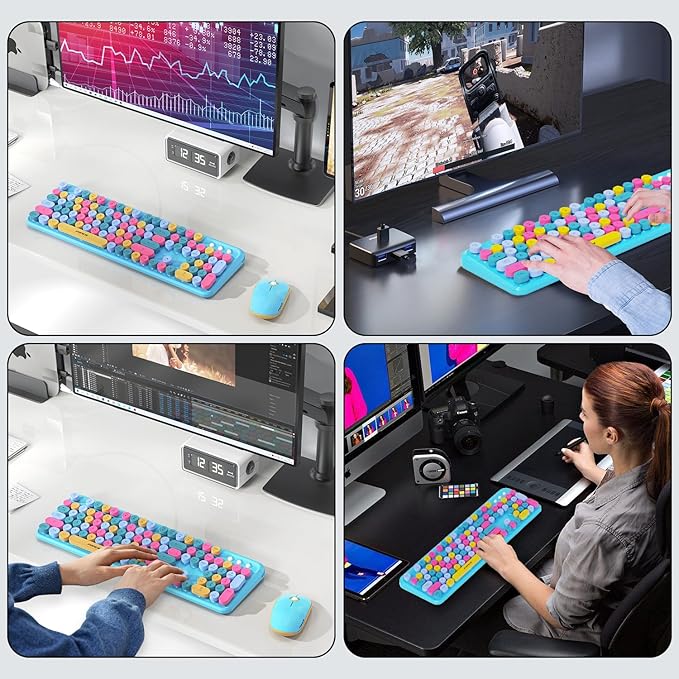 • 【 Wireless Keyboard Mouse Combo】The inspiration for these cute rounded keys comes from vintage typewriters offering you visual enjoyment and a retro feeling to type. With colorful key caps, make you be distinctive in the office and work full of fun.