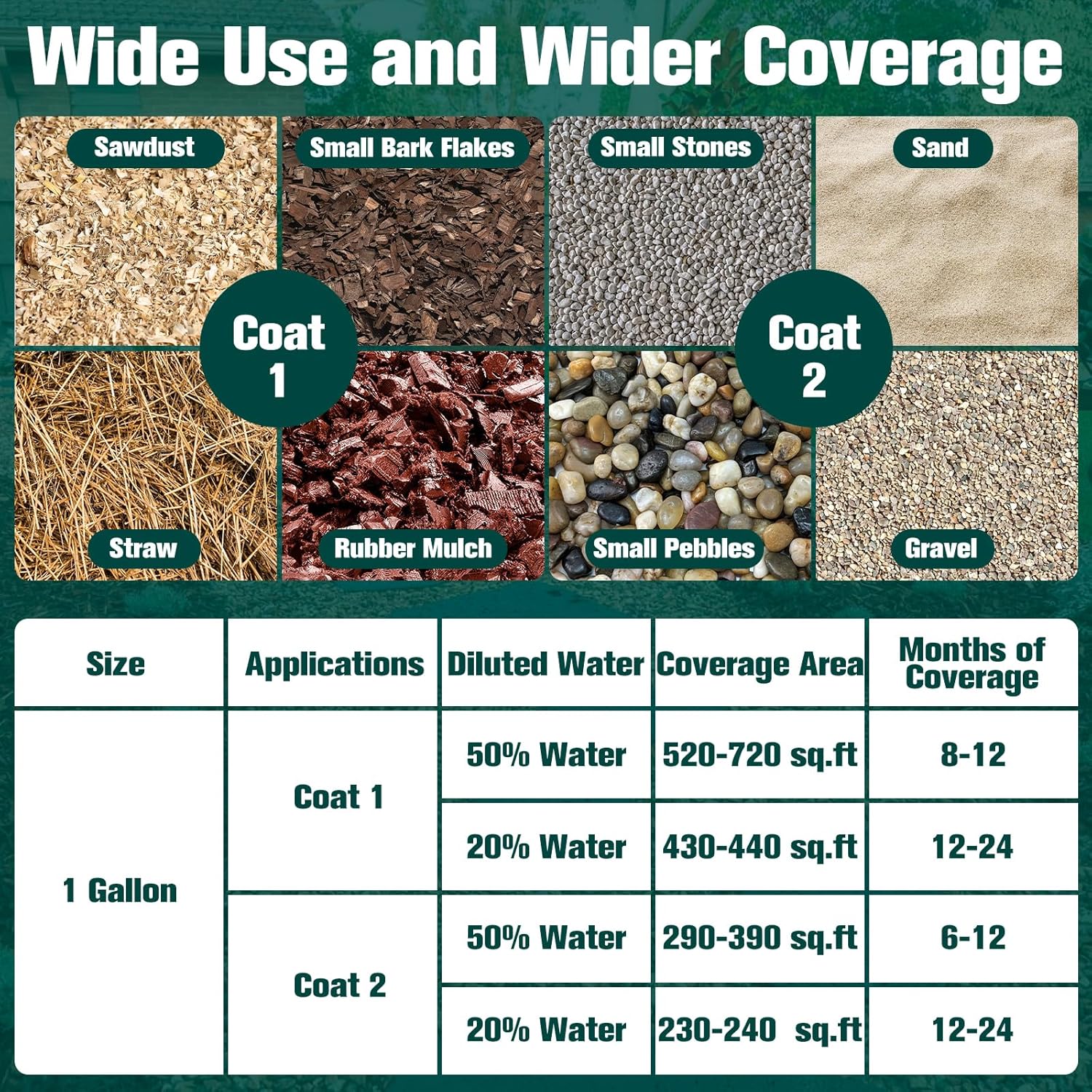 • 【Easy Application 】Strong Mulch glue spray is easy to apply - just shake and pour into a garden sprayer. For small mulch pieces, dilute with at least 10-50% water before using a sprayer to prevent clogging. After the initial application, rake or turn the mulch. We advise applying 2 - 3 coats for optimal results, allowing Mulch Glue Max to fully dry between each coat.