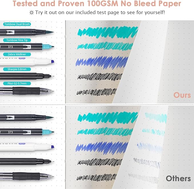 • 【Thick Paper for Writing Without Limits】Large B5 hardcover notebook (7.6"x 10"/193mm x 254mm), total 320 pages, includes 312 numbered pages(156 sheets). Each page includes 1887 dots with 5mm spacing: X37*Y51. Our INNOVATIVE PAPER TECHNOLOGY on 100GSM thick paper ensures a perfect canvas for your ideas - no bleed, no ghosting, as confirmed by tests with various pens commonly used in bullet journaling.