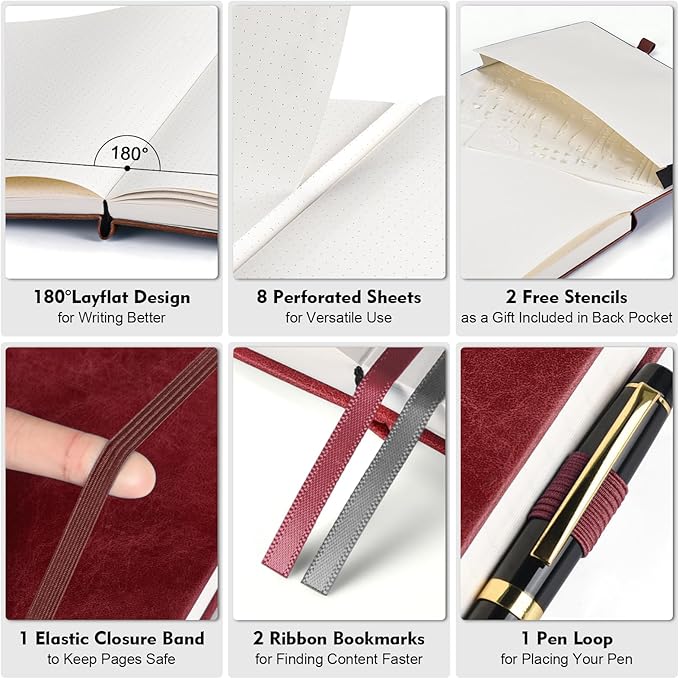 • 【Tough & Stylish Hardcover】Crafted from TOP-NOTCH VEGAN LEATHER with distinctive texture, which is animal-friendly and boasts a luxurious look. DURABLE hard cover provides superior protection to your pages compared to softcover, while offering a stable writing surface. Featuring an innovative thread-bound binding that allows for easy LAY-FLAT use, catering to both right-and left-handed users.