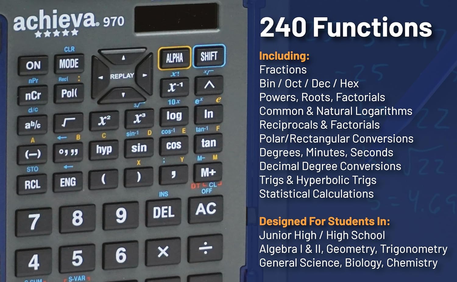 • 240 Functions: Including trigonometric functions and statistical calculations