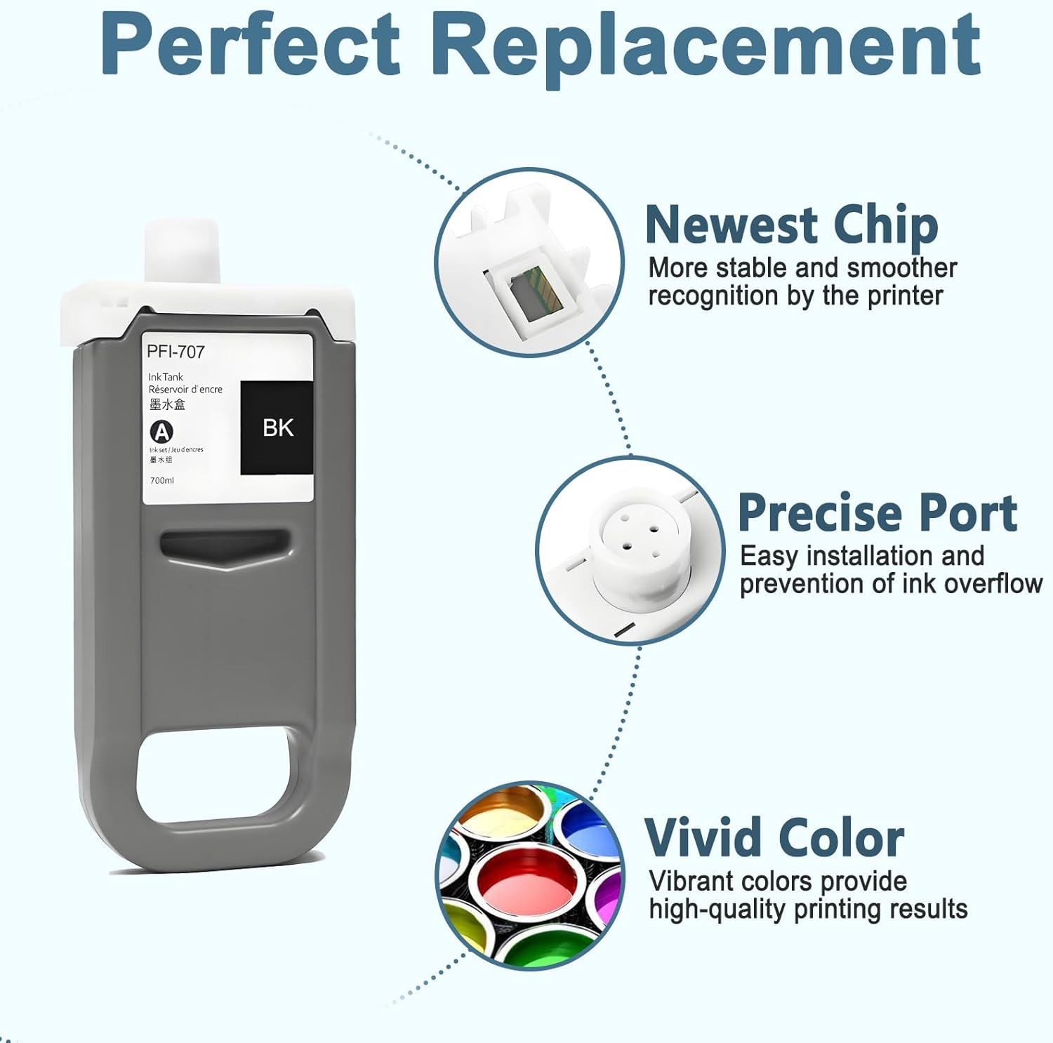 • Superior Quality: This high-yield PFI-707 ink cartridge uses the latest chip technology and high-quality pigment ink, with an anti clogging nozzle design and easy installation. Provide clear text and graphics, comparable to the original