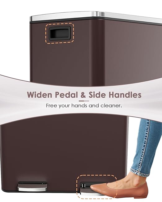 • THICK & WIDE PEDEL: Wide and thick stainless steel pedal is ergonomically designed, so you can throw out trash without bending over, and you don't need to touch the lid of the bucket when throwing out trash.