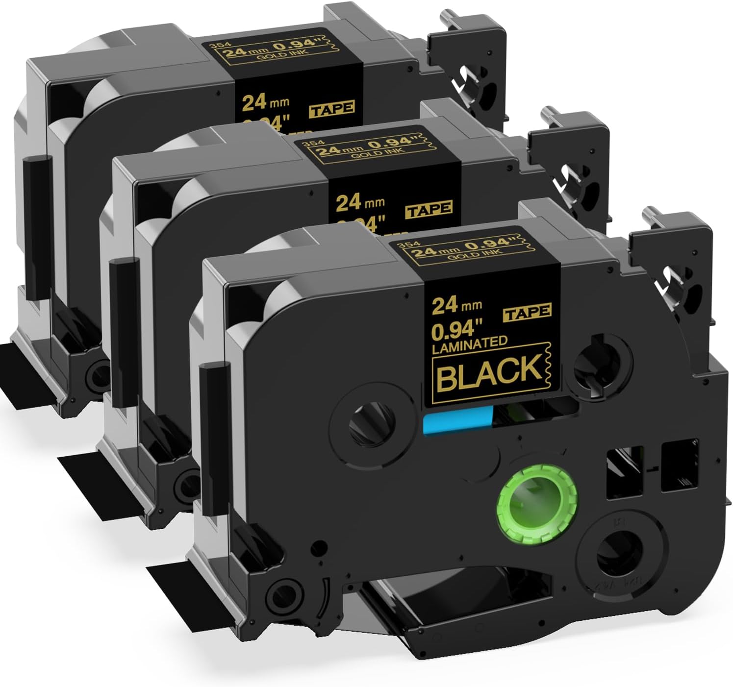 • 3-Pack compatible with brother p touch gold on black tape TZe-354 TZe354 24mm tze black tape. Color: Gold on Black. Width: 24mm (1") Length: 8m (26.2ft)