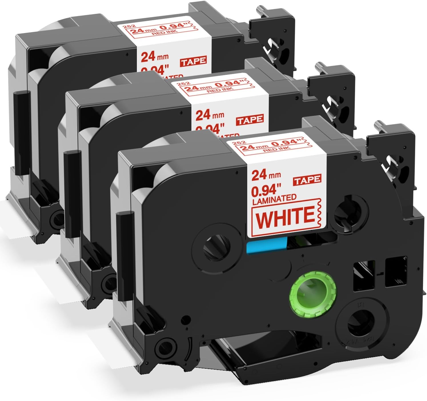 • 3-Pack compatible with brother p touch red on white tape TZe-252 TZe252 24mm tze tape. Color: Red on White. Width: 24mm (1") Length: 8m (26.2ft)