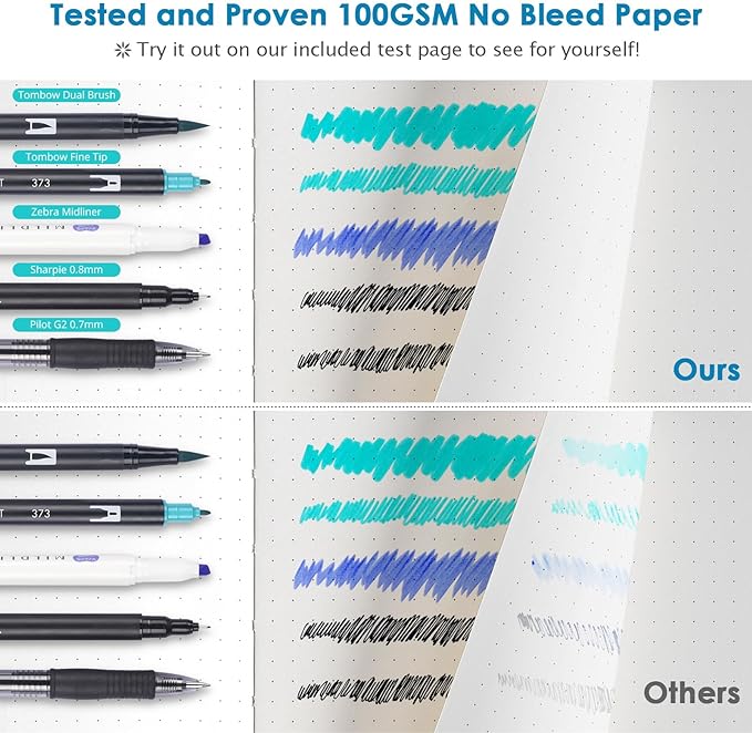 • 【Thick Paper for Writing Without Limits】Large A4 hardcover notebook (8.5'' × 11''/216mm x 283mm), total 320 pages, includes 312 numbered pages(156 sheets). Each page includes 2255 dots with 5mm spacing: X41*Y55. Our INNOVATIVE PAPER TECHNOLOGY on 100GSM thick paper ensures a perfect canvas for your ideas - no bleed, no ghosting, as confirmed by tests with various pens commonly used in bullet journaling.